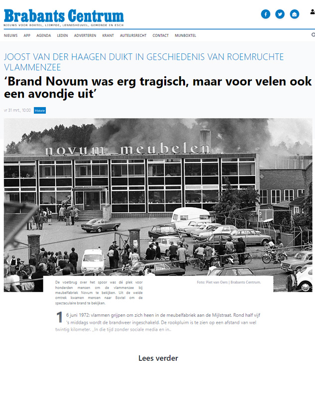 Op vrijdag 16 juni 1972 breekt in Boxtel een grote brand uit bij Meubelfabriek Novum. Het publiek komt massaal op het spektakelstuk af. Duizenden toeschouwers zien de immense vlammenzee, de instortende gebouwen en de heldhaftige acties van zo’n vijftig brandweerlieden van meerdere korpsen.