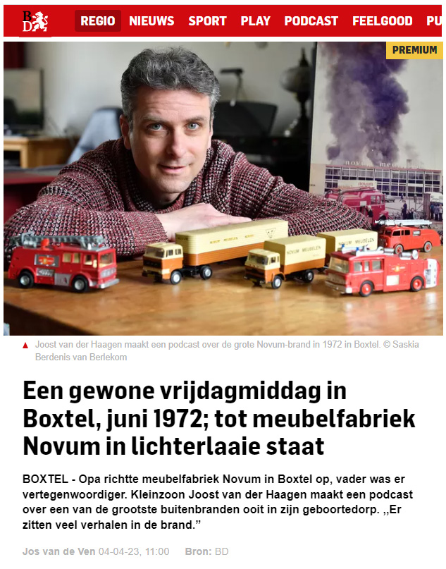 Momenteel maakt Joost van der Haagen, kleinzoon van oud-Novumdirecteur Adriaan van der Haagen, een podcast (luisterdocumentaire) over de grote brand bij Meubelfabriek Novum in Boxtel op 16 juni 1972.
