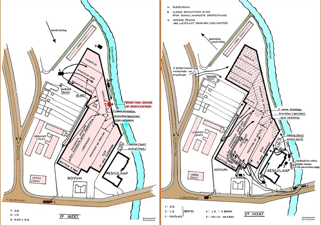 Op onderstaande plattegronden zijn materieel en manschappen aangegeven die bij de Novumbrand zijn ingezet. Deze situatietekeningen zijn naderhand gemaakt door de Boxtelse brandweer en zijn afkomstig uit het brandweerarchief van Rini van Oirschot.