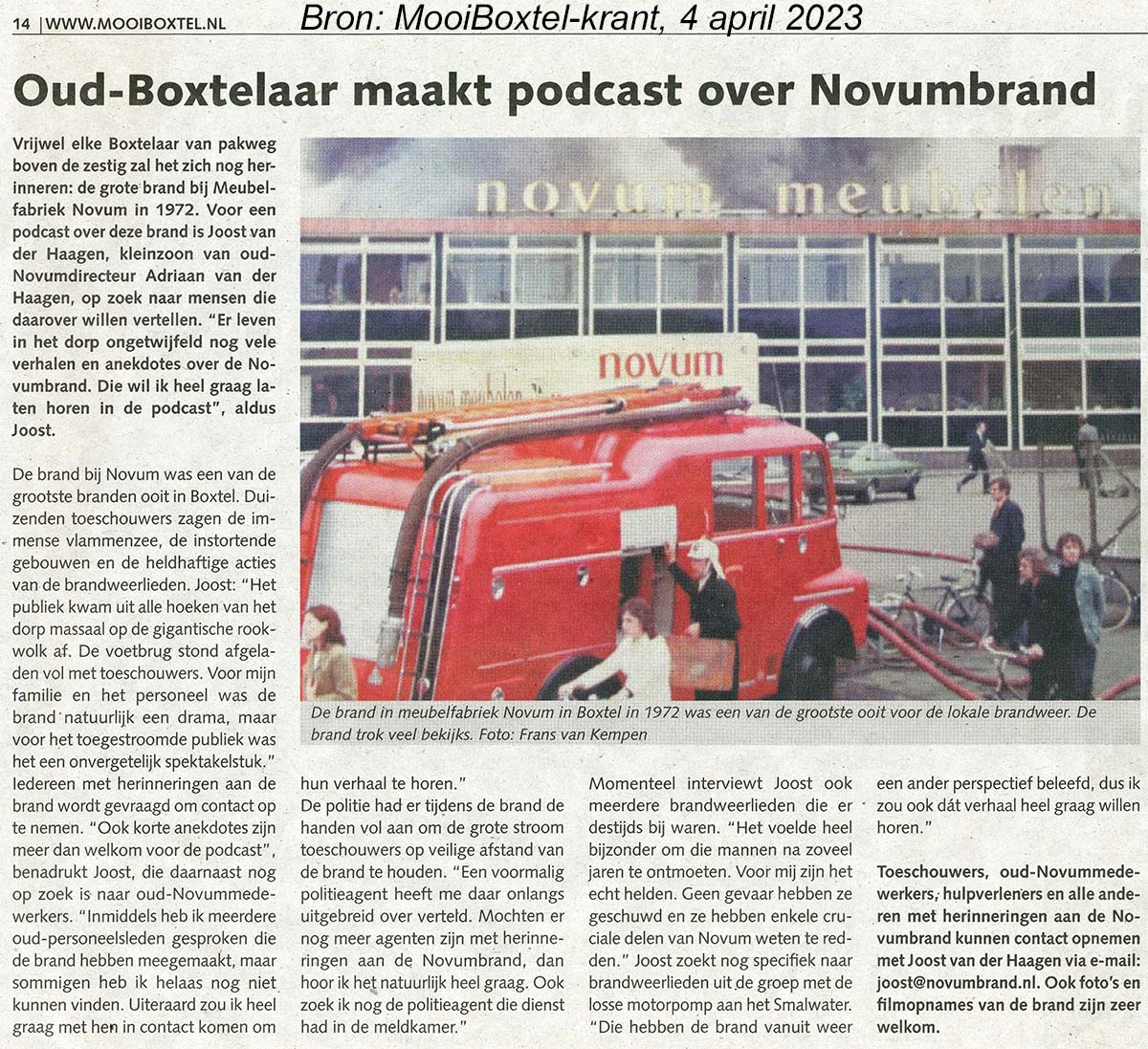 Heb je herinneringen aan de Novumbrand? Of heb je foto’s of film van de brand? Of een vraag of opmerking? Stuur een e-mail naar Joost van der Haagen via joost@novumbrand.nl